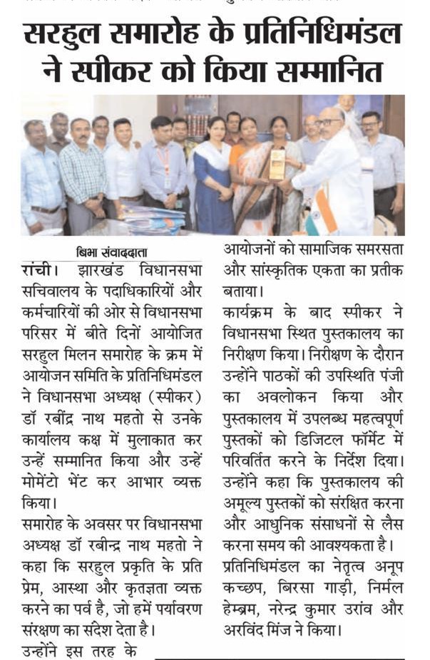 सभा सचिवालय के पदाधिकारियो एवं कर्मचारियों के द्वारा विधानसभा परिसर में सरहुल मिलन समारोह’ का आयोजन किया गया था। इसी कड़ी में आज दिनांक 17 अप्रैल, 2026 को सरहुल मिलन समारोह की आयोजन समिति से श्री अनूप कच्छप, श्री बिरसा गाड़ी, श्री निर्मल हेम्ब्रम, तथा नरेन्द्र कुमार उराँव एवं अरविन्द मिंज के नेतृत्व में समिति माननीय अध्यक्ष महोदय से उनके कार्यालय कक्ष में मुलाकात कर उन्हें मोमेंटो भेंट करते हुए आभार व्यक्त किया । श्री रंजीत कुमार प्रभारी सचिव झारखंड विधानसभा भी उपस्थित रहे।